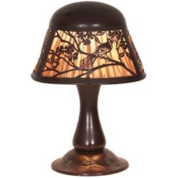 Heintz lamp, sterling over bronze, dome shade with reticulated panels over original silk liner, original patina, signed, 12”dia, 18”h, very good condition