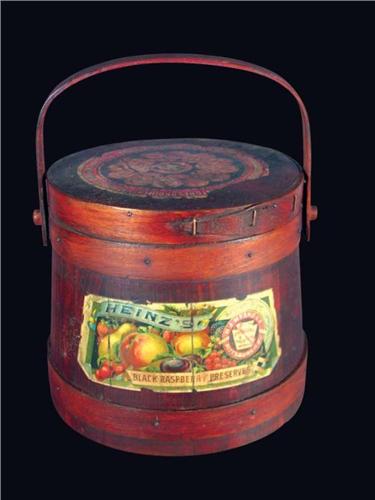 Heinz Black Raspberry Preserves Wood Pail with lid and bail. Paper loss and discoloration to lid label otherwise good condition. 7 1/2 inches tall without bail.