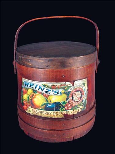 Heinz Black Raspberry Preserves Wood Pale with lid and bail. Some paper loss to front label otherwise good condition. 9 3/4 inches tall without bail.