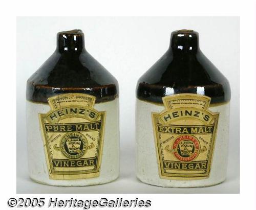 <B>Heinz Malt Vinegar- Two 1880s Brown and White Mini Jugs</B></I> Heinz is currently one of the largest producers of vinegar in the world and they have, on their quality control staff, a vinegar taster. I wouldn't really want that job myself but anyone should want these great old small handled corked jugs. One is for Heinz's Extra Malt Vinegar and the other, Pure Malt (I'm sure that vinegar taster could tell the difference!). These are likely from the late 1880s, are 3.5" tall and 2.25" in diameter and are in very fine condition. Lot:252