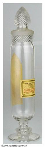 <B>Heinz Pickles Early 10 1/2" Display Jar</B></I> Unusual for its size and the early 1869 label on front and content description label on the back. The original top matches the design around the neck and along the pedestal base, with the lid being ground around its base and on the inside of the neck of the jar. The jar is perfect with no chips and the label shows little wear. The design of the label is typical of the toleware type coloration of the labels of the late 1800s. This would be a tough piece to find even without the label in this nice condition. Lot:252