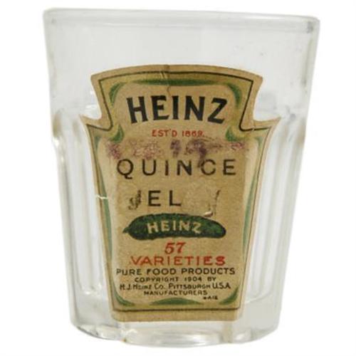<B>Heinz Sample Quince Jelly Jar.</B></I> 2 tall, 1.75 in diameter at the top. A diminutive glass sample jar, round at the top with six fluted sides at the base. The Heinz label bears a 1904 copyright date. The jar has one very small chip at the bottom edge of one of the fluted sides otherwise it is in very good condition. The label is moderately worn with some loss to the word Jelly, else very good condition. <BR><BR><b>Shipping:</b> Miscellaneous Collectibles, Smal (<a target="_blank" href="http://www.heritageauctions.com/common/shipping.php">view shipping information</a>)