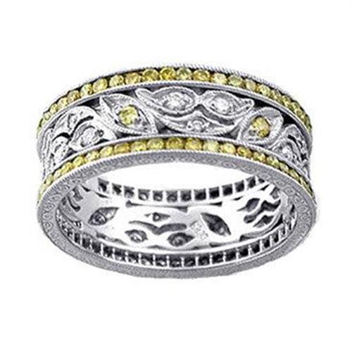 Platinum natural color fancy yellow and white diamond band. Beautiful floral work in center bejeweled with yellow and white diamonds, bordered by a row of high quality fancy yellow diamonds on each side. White Diamonds are brilliant cut H color, VS1 clarity. Approximately 2.00 carats of diamonds. 8.50mm wide. Small surcharge for sizes over 7.5. 10% restocking fee for returns of sizes under 5 and over 7.