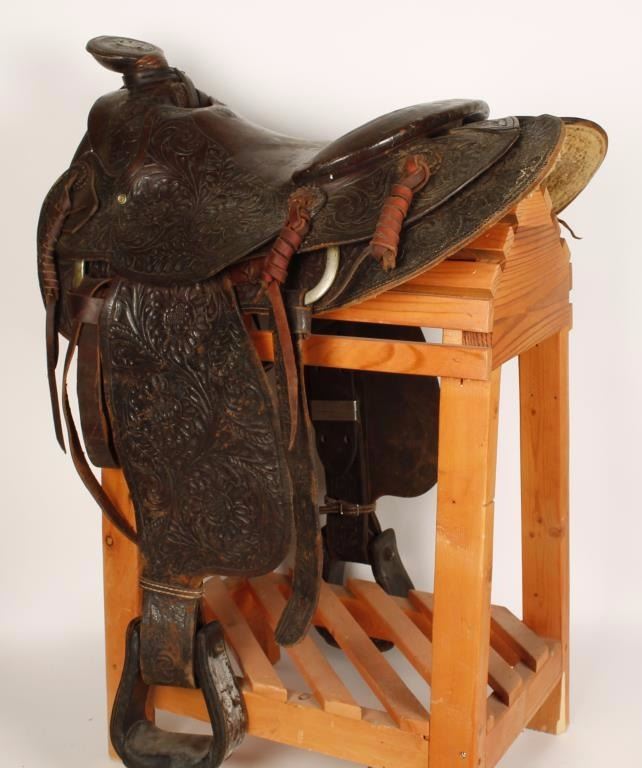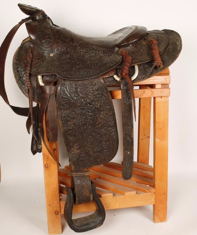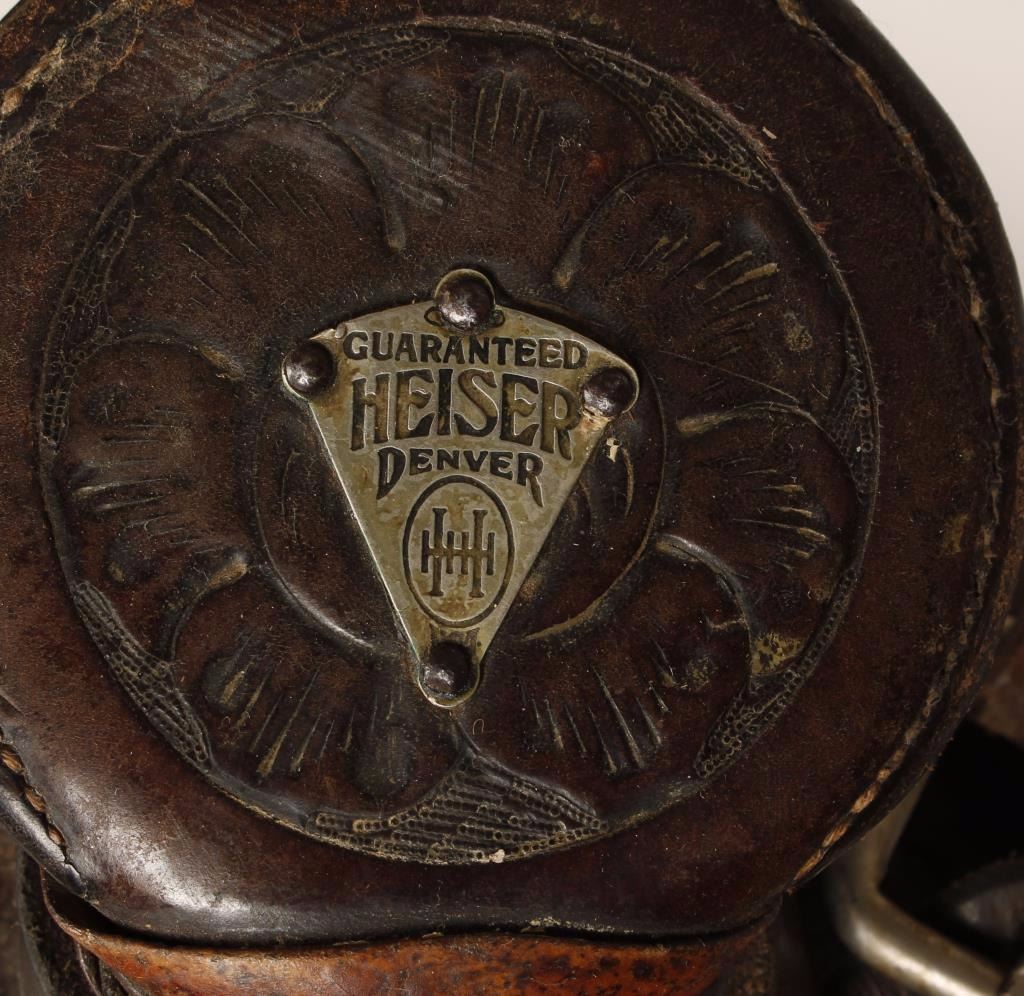 Maker marked, with large horn and round skirt. Large size with a 17" seat, overall fair condition, shows age. Made in Denver, CO circa 1960s type.