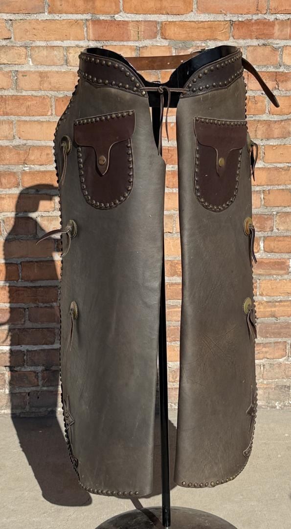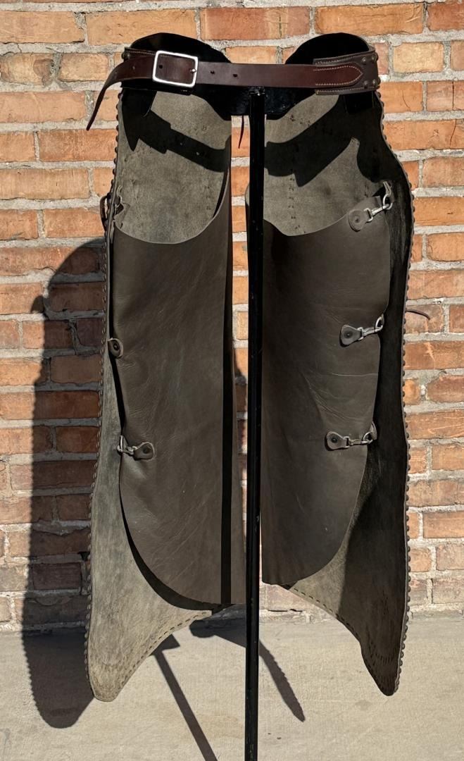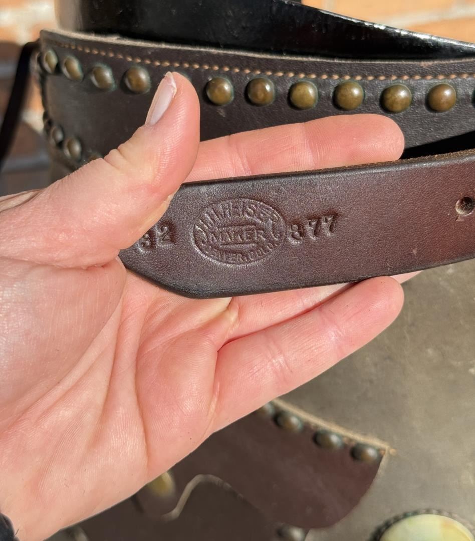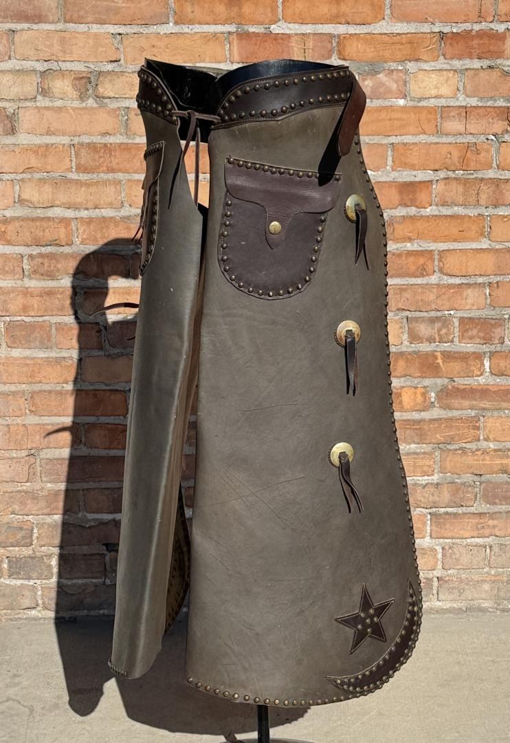 Heiser Denver snap covers on the outside pockets, 39" tall and belt to fit a 32" waist. Marked with the oval mark and 877 on the belt. 1930s.