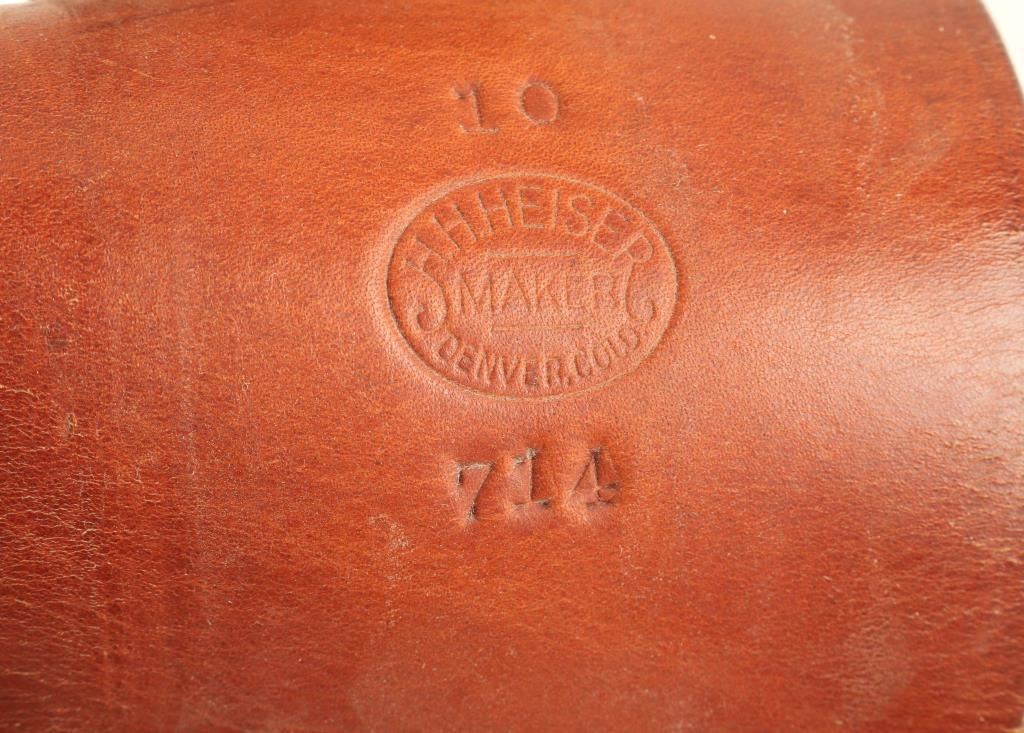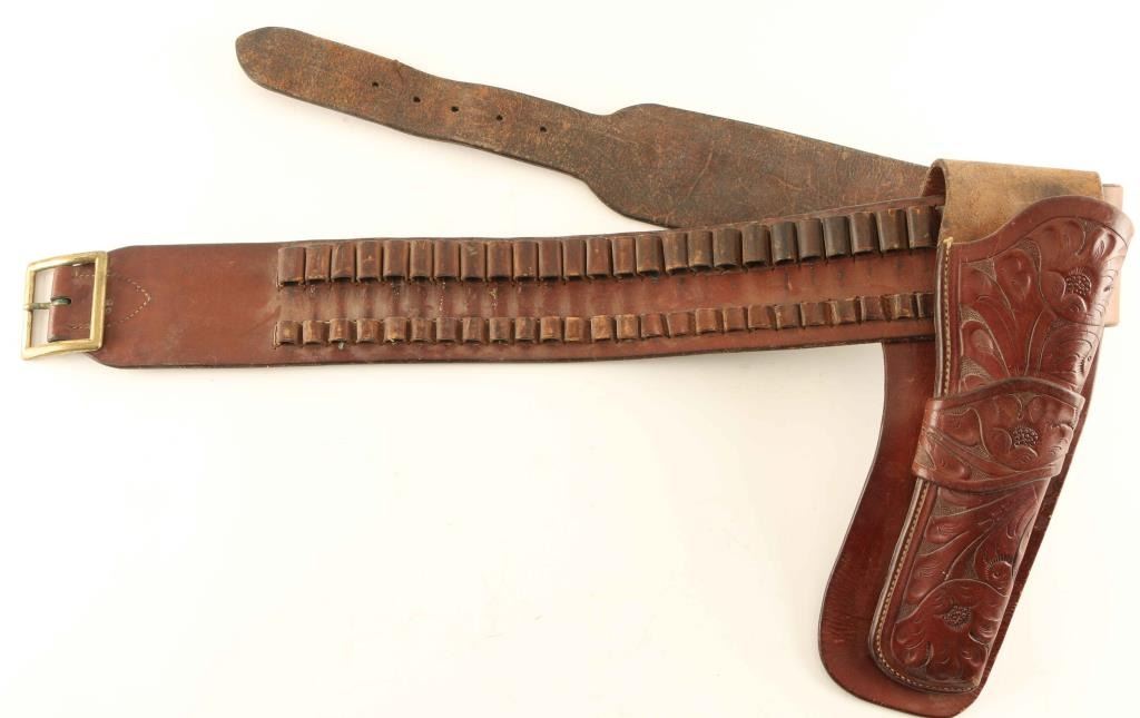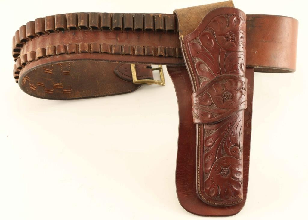Smooth brown leather belt with floral tooled holster for a 71/2" Colt, maker marked measures 44" overall