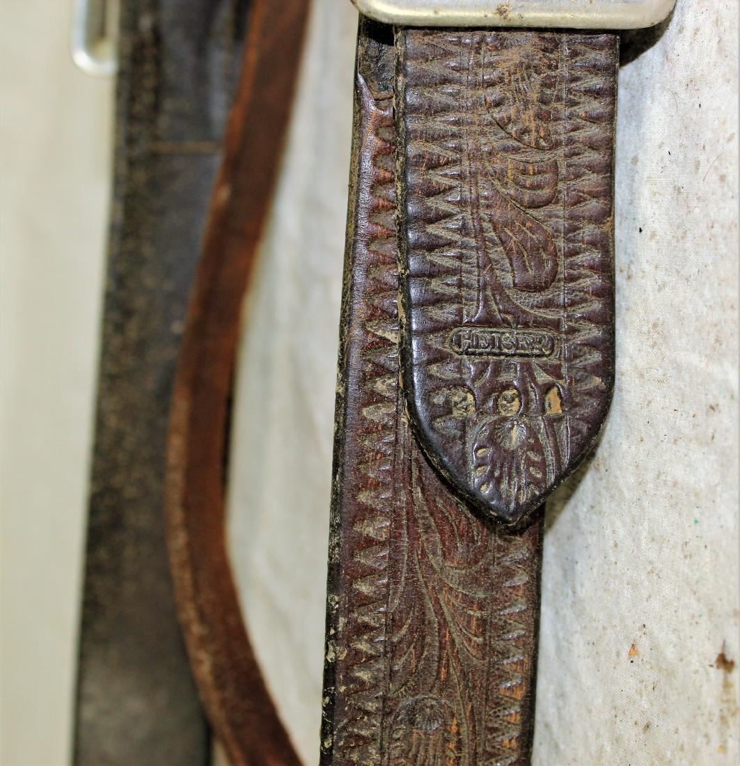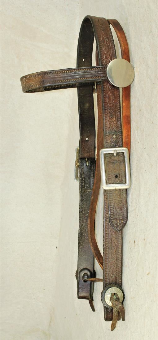 Full flower embossed headstall with large nickel buckles and rosettes, showing nice light color and condition.