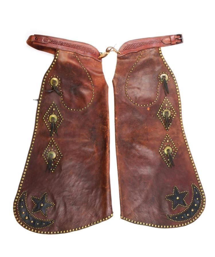 Super nice pair of two-tone chaps with great stud pattern, star and moon design and basket stamped belt. Nicely marked on billet.