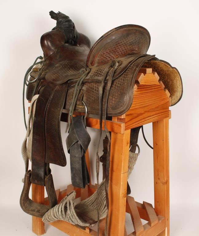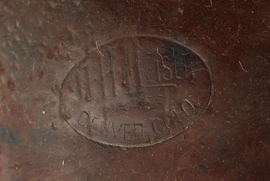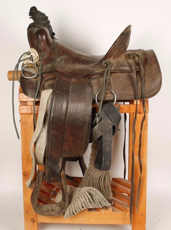 Brown leather construction with a basketweave stamped design. Maker marked, square skirted with a 16" seat. Condition is poor. Appears the horn has been repaired with rubber tubing.