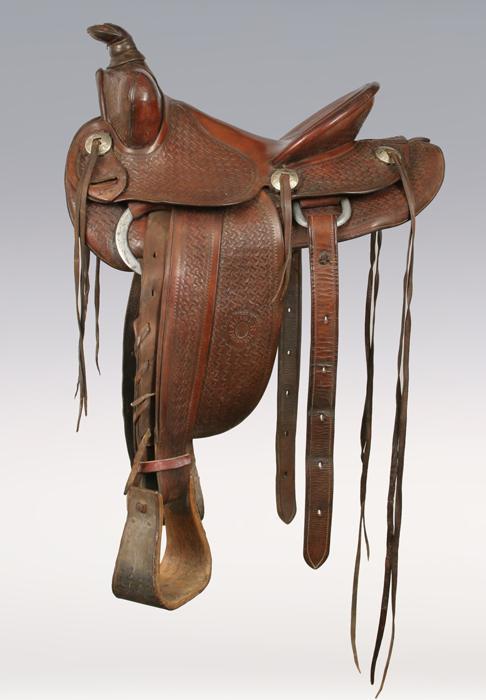 Heiser Woman's Embossed Saddle. 14". C. 1940s. Rideable. Condition Report: Fine condition.