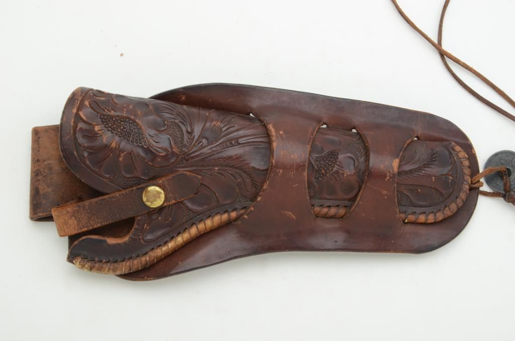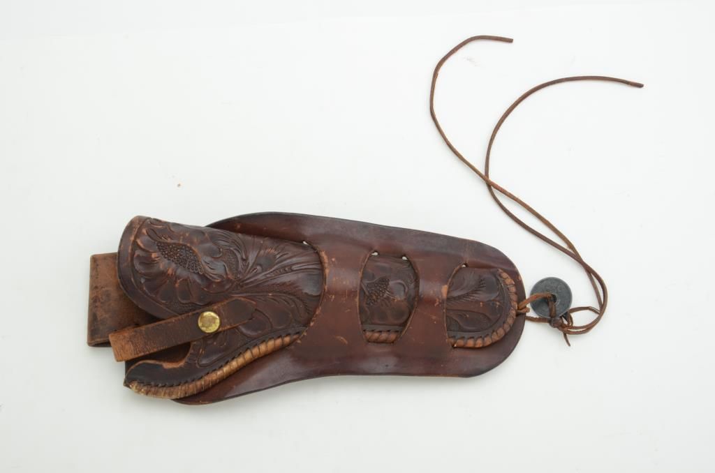 Heiser marked tooled leather holster, Denver, Colorado, for large revolver, 7-1/2” barrel, old Mexican coin concho added and dated 1871. Est.: $200-$400.