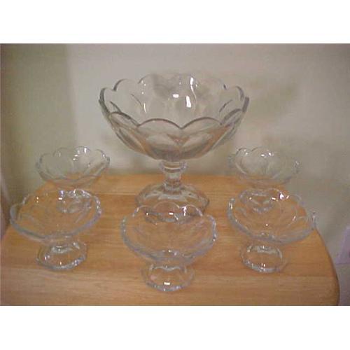 Heisey, 6 Pc. Fruit Set, signed, lrg. 9 a' Diameter; 7.75" tall Bowl; (5) 5" dIAMETERF; 3.25 TALL pEDESTAL dISHES; (C) READY FOR USE. nO DINGS-CRACKS, ETC.; VERY HEAVY GLASS; BEAUTIFUL.