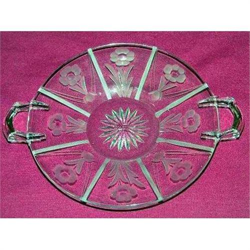 Heisey round snack plate in an etched rib and panel design with two handles. Marked with the Heisey H inside diamond shape. No nicks, chips or cracks. Measures 6.5" in diameter and 8" handle to handle.