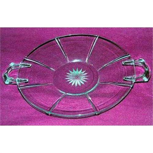 Beautiful Heisey snack plate in the rib and panel design with two handles. Marked with the Heisey H inside diamond shape. No nicks, chips or cracks. Measures 6.5" in diameter and 8" handle to handle.