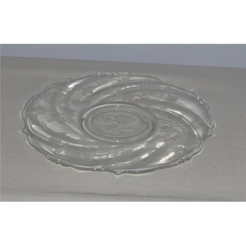 This sandwich plate is 10 1/2 inches in diameter. It differs from the very rare 10 1/2-inch dinner plate in that it has a 4-inch diameter center ring. It is in the Waverly shape with the etched Heisey Rose design.<p>