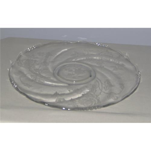 This torte plate is 14 inches in diameter. It has a 4 1/2-inch diameter center ring. It is in the Waverly shape with the etched Heisey Rose design.<p>
