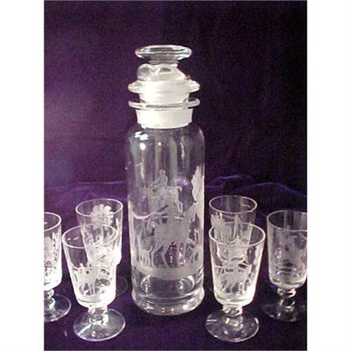 Heisey Shaker Set in Foxchase Pattern. Deep Plate Etch #462 - Exquisite! This Foxchase Shaker Set is beautifully etched as only Heisey can do. The pattern, discontinued in the late 30's, is sure to please all collector's. The set comes with 4 cocktail cordials in very good condition and 2 bonus cordials that each have a chip.