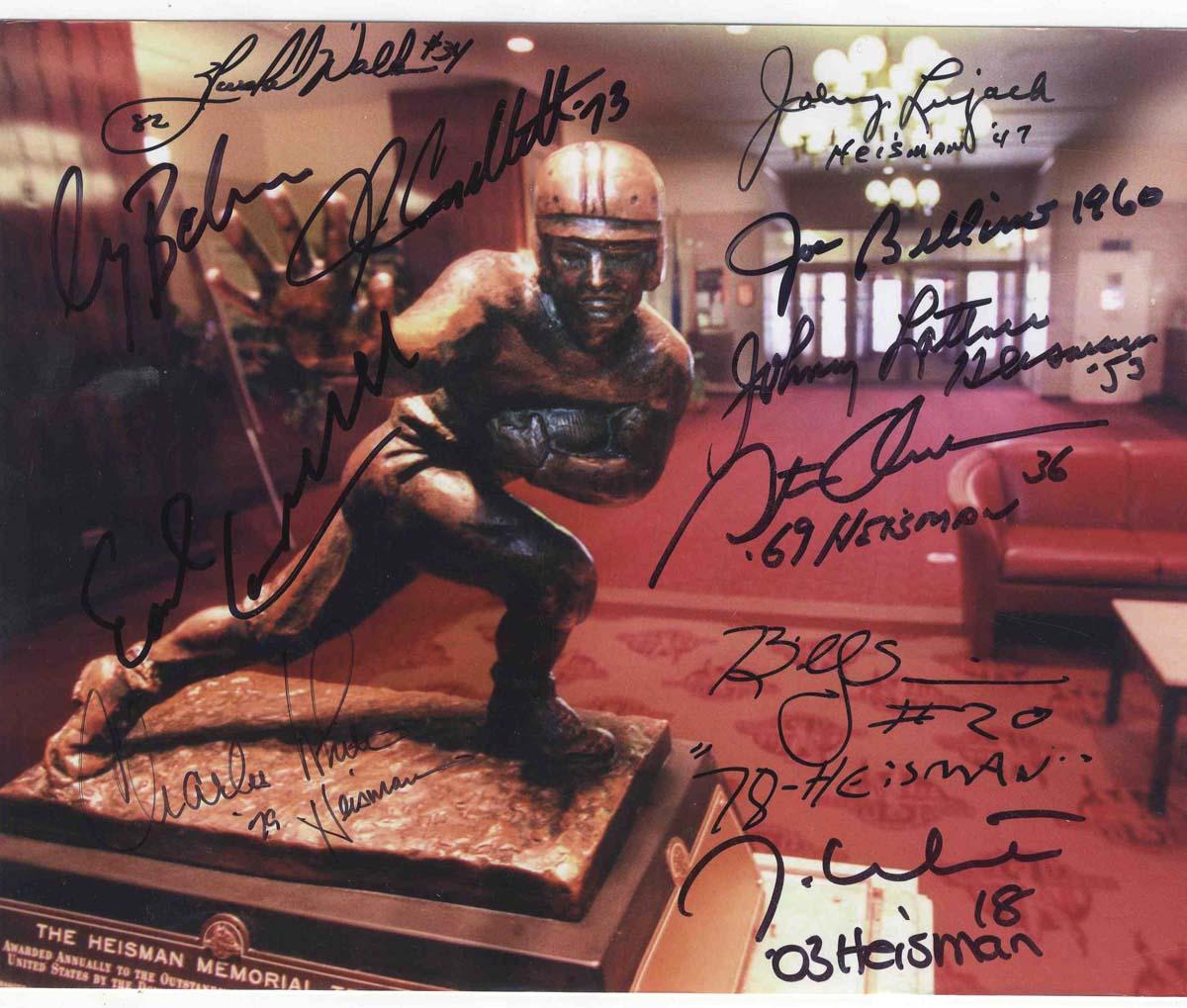 Impressive 10'' x 8'' glossy photo signed by 11 winners of the Heisman Trophy dating from as early as 1947 up until 2003. Signed upon a color photograph of the trophy are the autographs of Charles White, Earl Campbell, John Cappelletti, Gary Beban, Herschel Walker, Jason White, Billy Sims, Steve Owens, Johnny Lattner, Joe Bellino & Johnny Lujack. Fine condition.