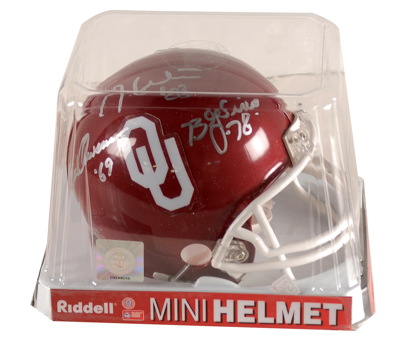 Official Riddell Oklahoma Sooners football mini-helmet signed in silver ink on the sides by Sooner Heisman Trophy winners Steve Owens, Billy Sims, and Jason White, each adding the year of their award. In fine condition.