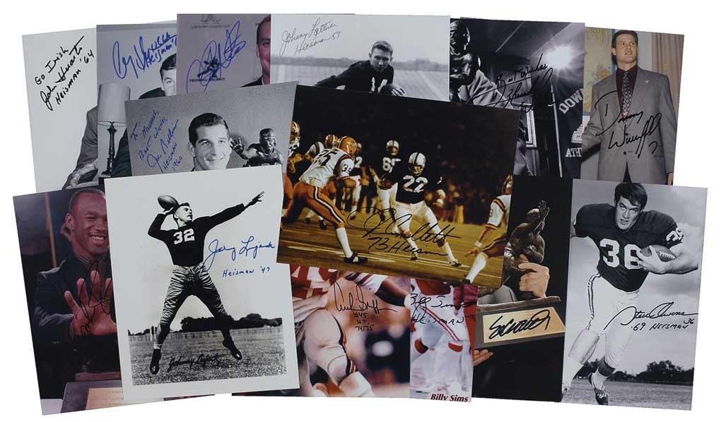 Fourteen glossy photos, eleven 8 x 10 and three 10 x 8, including three color, each signed in ink or felt tip by the respective Heisman winner pictured. Signers are: Gary Beban, Chris Weinke, Steve Owens, Eric Crouch, Mike Rozier, Herschel Walker, John Cappelletti, Archie Griffin, Johnny Lujack, Johnny Lattner, Joe Bellino (ins), Billy Sims, Danny Wuerrfel, and John Huarte. In fine condition.