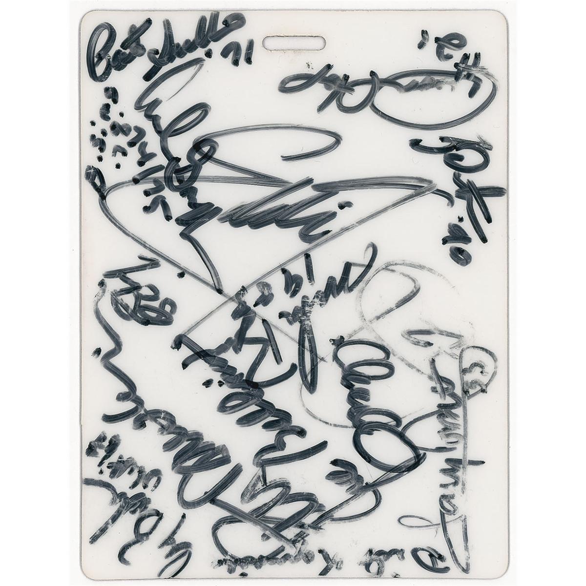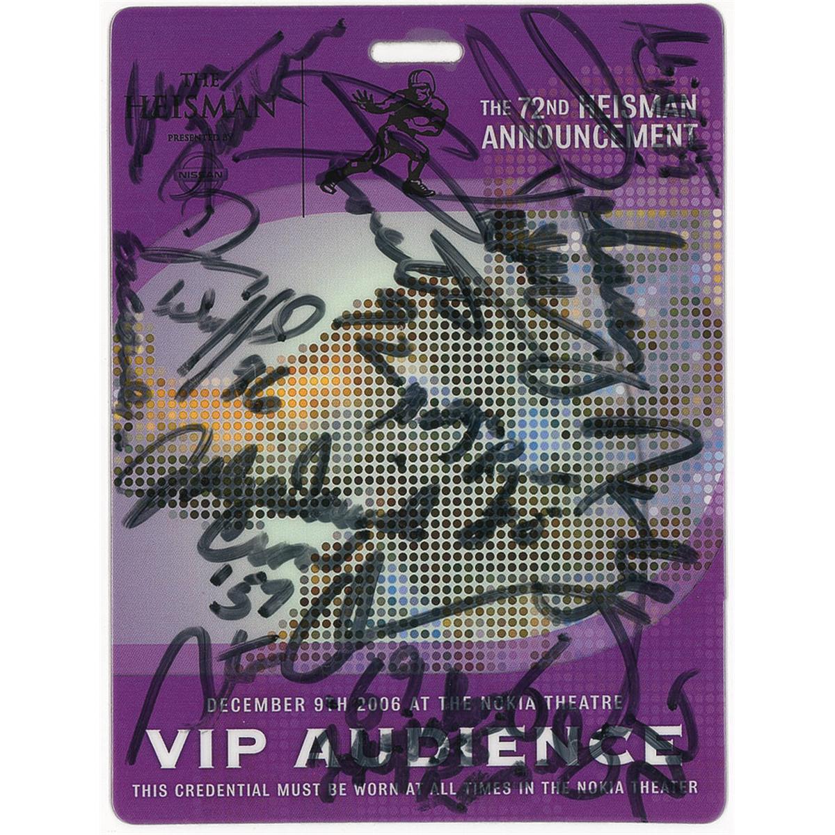 Heisman Award announcement VIP badge from the 2006 ceremony, 3.75 x 5, signed in black felt tip on the front and back by twenty attendees. Signers include: Eddie George, Tony Dorsett, and Archie Griffin. Accompanied by a full letter of authenticity from PSA/DNA. In fine condition, with some signatures a shade light but still fully legible.