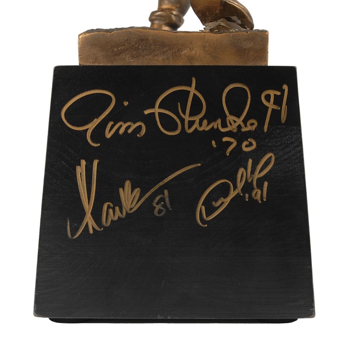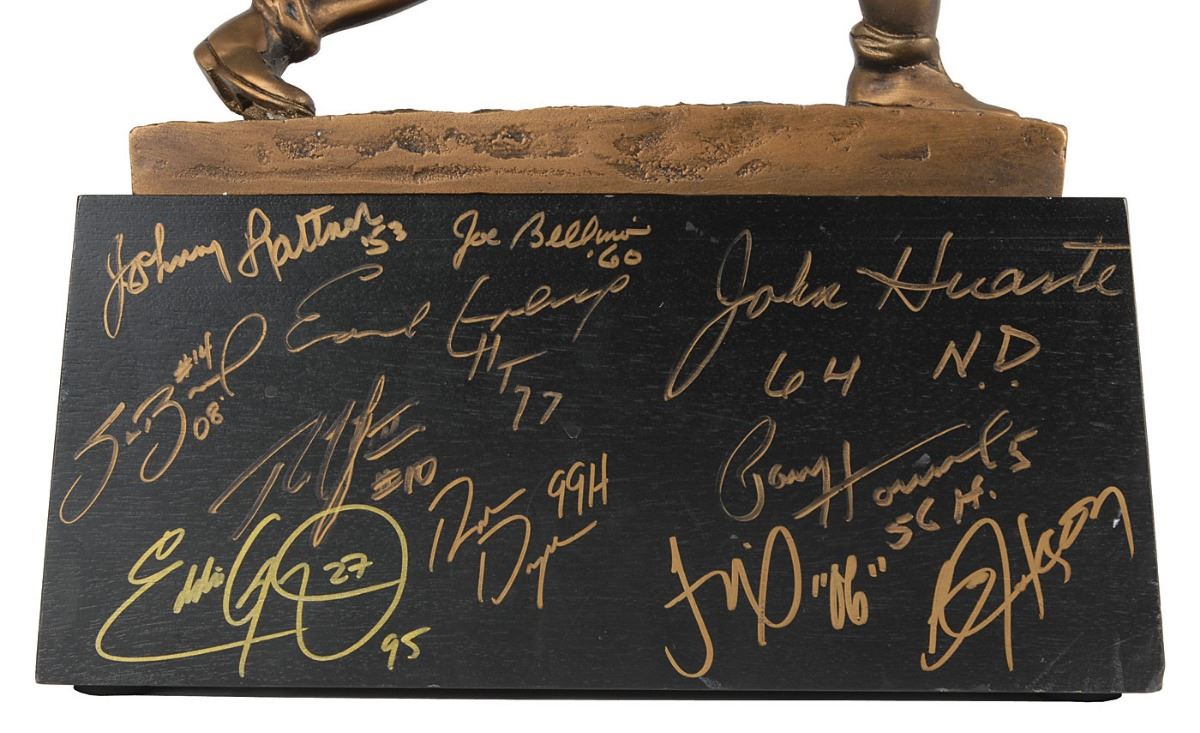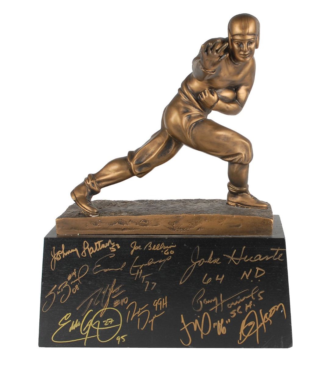 Replica of the Heisman Trophy, measuring 13.75 x 18 x 7, signed on the base in gold ink by thirteen winners, including: Earl Campbell, Johnny Lattner, Joe Bellino, John Huarte, Paul Hornung, Bo Jackson, Eddie George, Marcus Allen, Jim Plunkett, Desmond Howard, Sam Bradford, Ron Dayne, Troy Smith, and Robert Griffin III. In fine condition, with a few repaired cracks to the fragile statue.