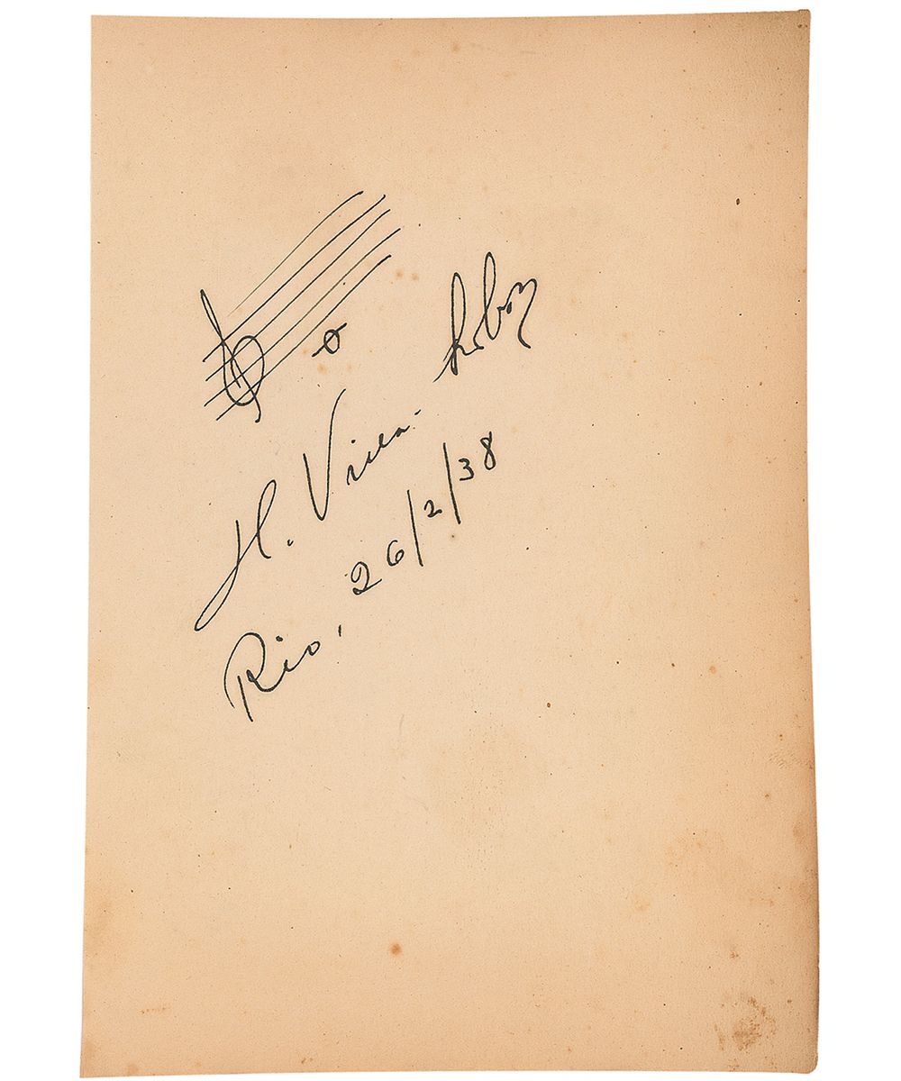 Composer and conductor (1887–1959). His many compositions include 12 symphonies, as well as operas, large-scale symphonic poems, concerti, and ballets. He is also known for the nine suites Bachianas Brasileiras, in which he treats Brazilian style melodies in the manner of Bach. Rare AMQS on an off-white 4.75 x 7 album page. Villa-Lobos pens a single note of music, signing underneath, “H. Villa-Lobos, Rio 26/2/38.” Scattered toning and foxing, heavier to edges, otherwise fine condition. Just the second time we have offered a quote from the composer described by many as “the single most significant creative figure in 20th-century Brazilian art music.”