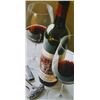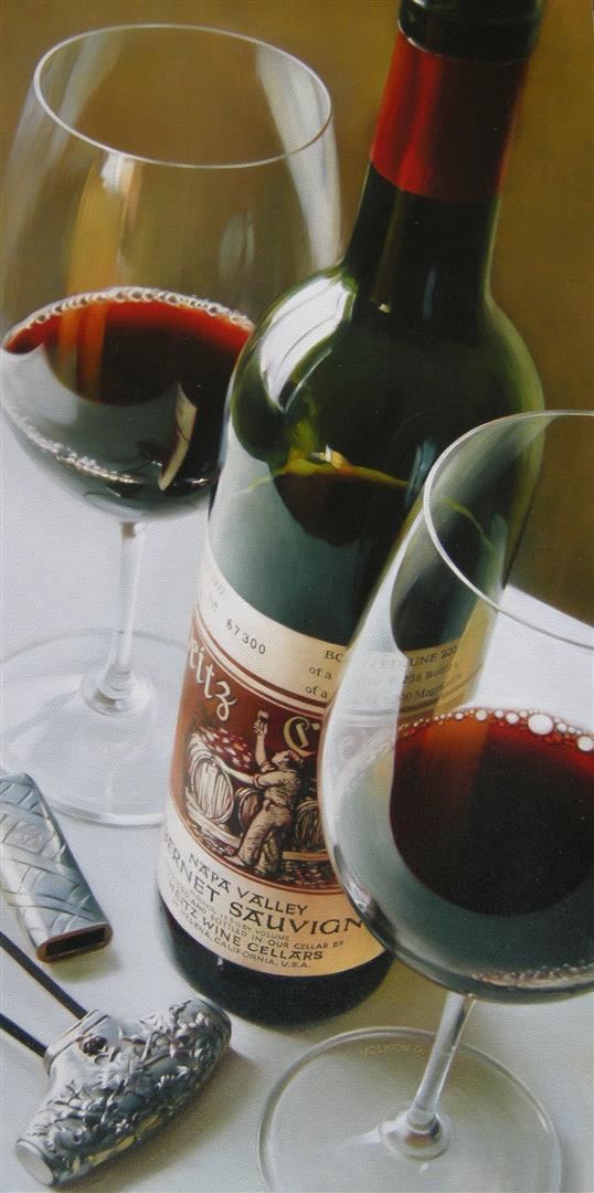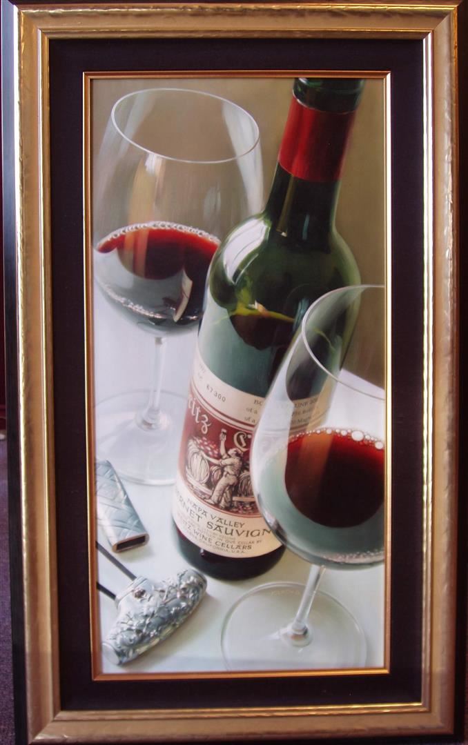 Heitz Cabernet Savignon, Napa Valley overlooks an ornate, silver bottle opener and two glasses of wine in Dmitriy Volkov's oil on canvas. The painting measures 35.5 x 18; framed image measures approx. 47.5 x 30.