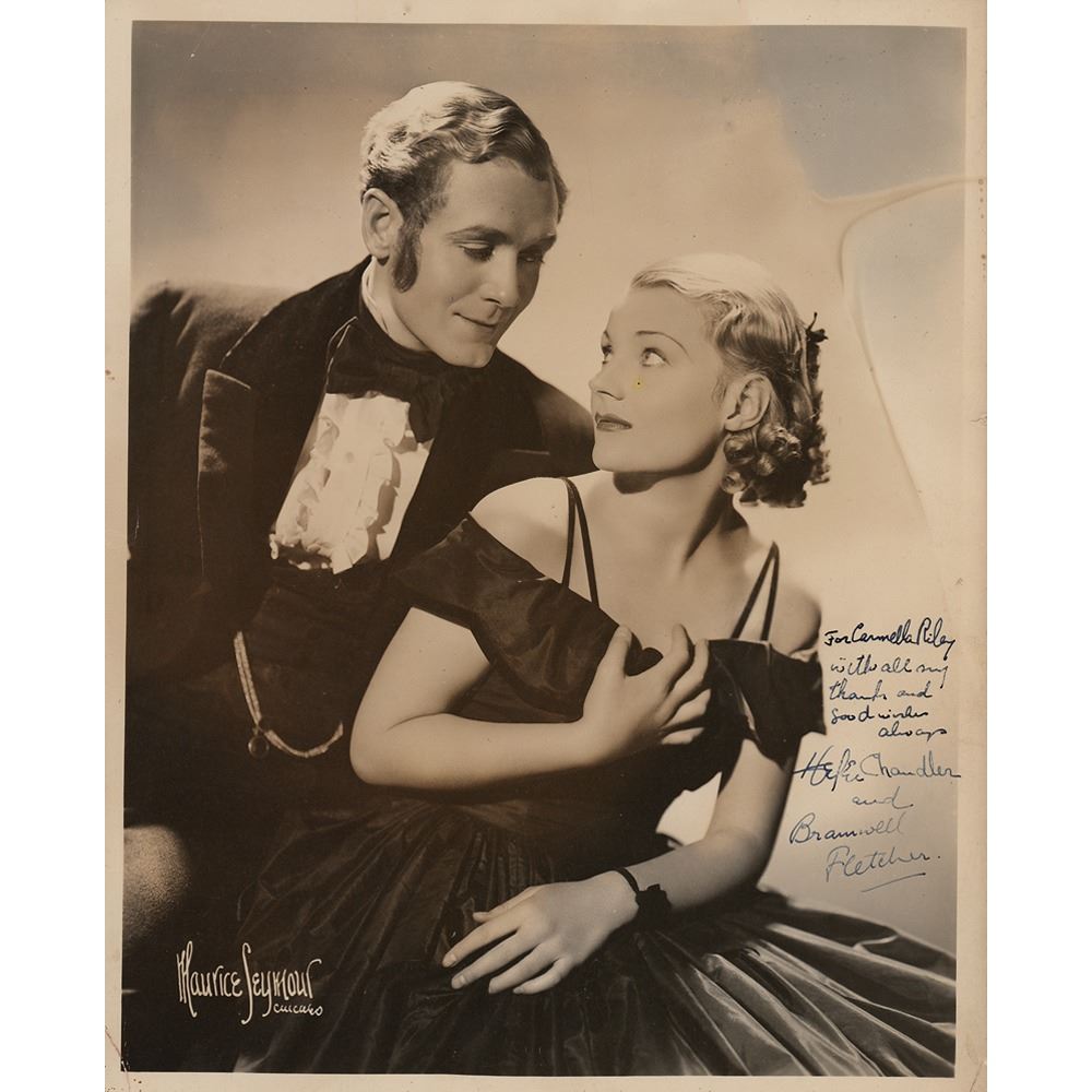 Vintage matte-finish 8 x 10 Maurice Seymour photo of the husband-and-wife acting duo dressed for one of their stage productions, signed and inscribed in fountain pen, "For Carmella Riley, with all my thanks and good wishes always, Helen Chandler" and "and Bramwell Fletcher.” In fine condition, with irregular staining to the background. Chandler, known for her iconic role as Mina Harker in the 1931 classic Dracula, and Fletcher, known for his role as Ralph Norton in 1932's The Mummy, were married for roughly five years, during which time they starred together in a number of stage plays both in the U.S. and in England. A desirable tandem from two of horror's most influential films.