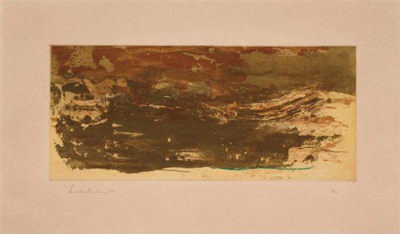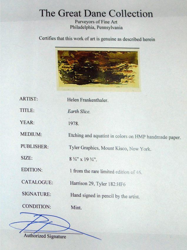 Helen Frankenthaler "Earth Slice" Etching and Aquatint in colors on HMP handmade paper. Size: 8.75" x 19.75" Year: 1978 Edition: 1 from the reare limited edition of 46. Hand signed in pencil by the artist, comes with COA and unframed. WN14250