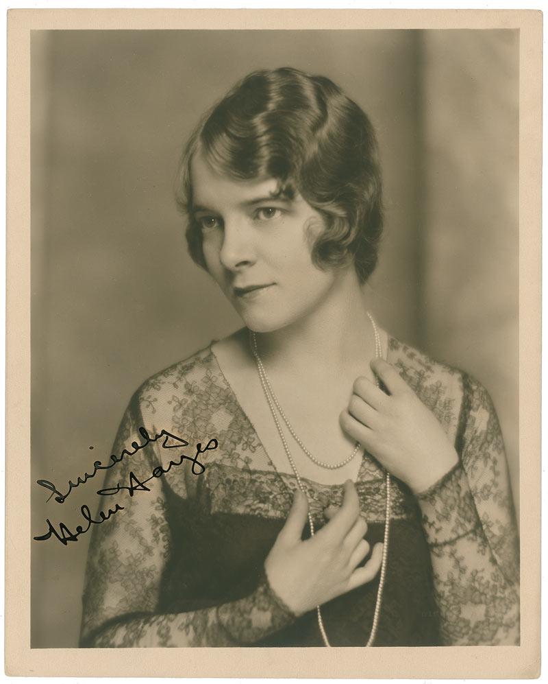 Vintage matte-finish 8 x 10 Nickolas Muray photo, signed in fountain pen, “Sincerely, Helen Hayes.” A vertical crease and mild ripples to top edge, some small corner creases, and scattered light edge soiling, otherwise fine condition.