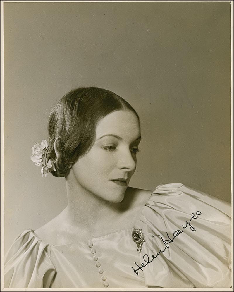 Vintage pearl-finish 8 x 10 photo, signed in fountain pen. Credit stamped on the reverse “Helen Hayes in Victoria Regina Broadhurst Theatre” with a 1937 newspaper caption affixed. A couple of creases in the background and a faint numeric remnant, otherwise fine condition.