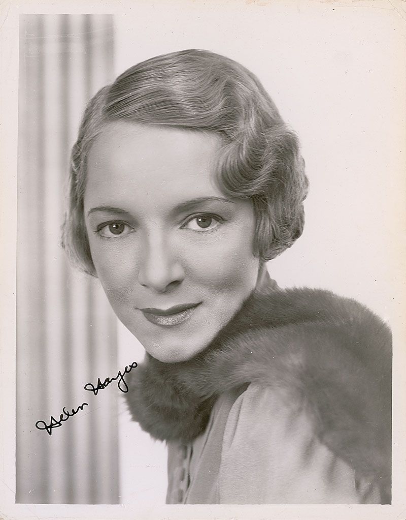 Vintage glossy 8 x 10 head-and-shoulders photo of a young Hayes, boldly signed in fountain pen. Light scattered creases and surface impressions, otherwise fine condition. According to a collector’s notation to the reverse, the signature was obtained at the Broadhurst Theatre on February 21, 1936.