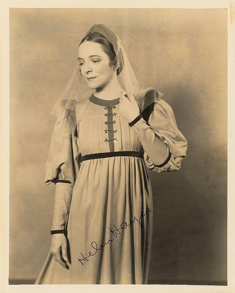 Lovely pearl-finish 8 x 10 three-quarter-length portrait of Hayes in a dress, signed in black felt tip. Reverse bears an original Vandamm Studio photographer’s stamp. In fine condition, with a crease to the lower right corner and trivial area of toning to the upper right corner.