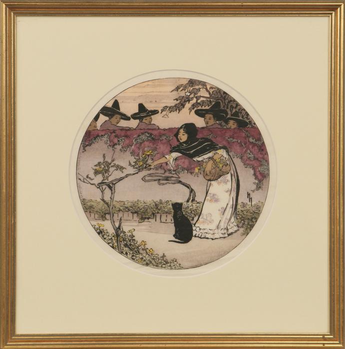 Helen Hyde (1868-1919). A Mexican Coquette. 10" circle woodcut print. Signed lower right. Dated 1912 along left border. Condition Report: Fine condition.