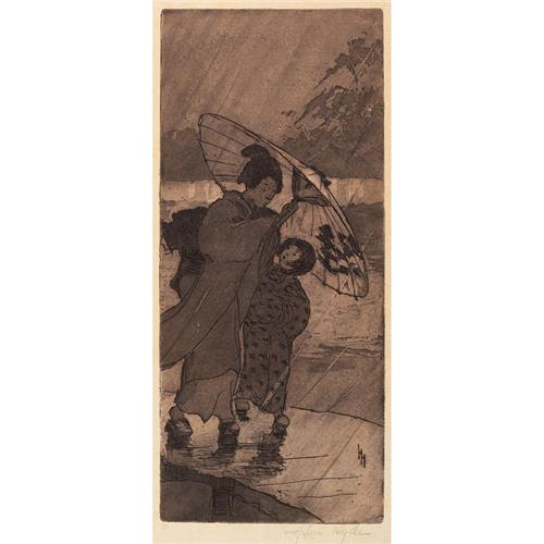 Helen Hyde woodblock, "A Rainy Night", signed, 9" x 13", matted, framed
