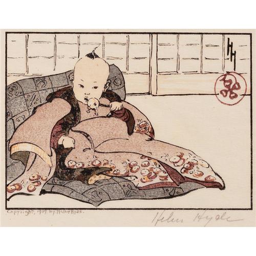 Helen Hyde woodblock, colorful print titled "Hired Baby", signed, dated 1909, matted, unframed, 5" x 3.5"