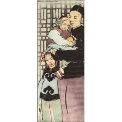 Helen Hyde woodblock, colorful print of three Asian girls, signed three times, dated 1914, matted, framed, 5" x 13"