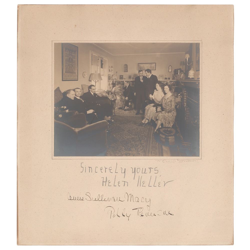 Rare vintage matte-finish 8.5 x 6.5 photo of Keller and her assistant, Polly Thomson, seated in their home in Forest Hills, New York, with other guests, affixed to its original 12.5 x 14 mount, prominently signed on the mount in pencil, "Sincerely yours, Helen Keller," and in ink, "Anne Sullivan Macy" and "Polly Thomson." Also signed below the image by the photographer, "F. Garcia Monteiro." In very good to fine condition, with creasing to the upper left corner, a short tear to middle of the top edge, a couple of tape repairs on the mount's reverse, and the photo attached only by its bottom edge. Items signed by Keller, her companion Thomson, and her teacher Sullivan are very scarce.