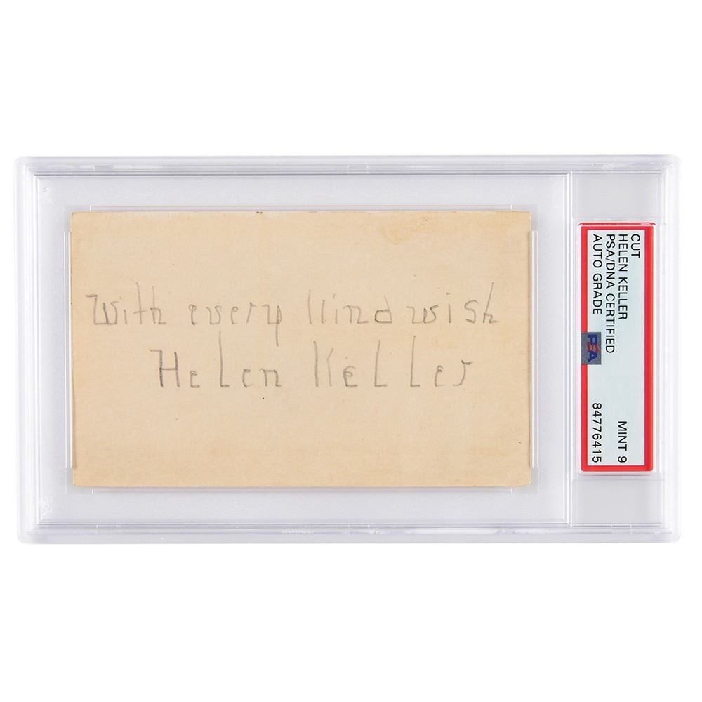 Sought-after pencil signature, "With every kind wish, Helen Keller,& rdquo; on an off-white 5 x 3 card. In fine condition, with old adhesive residue on the back. Encapsulated and graded by PSA/DNA as "MINT 9."