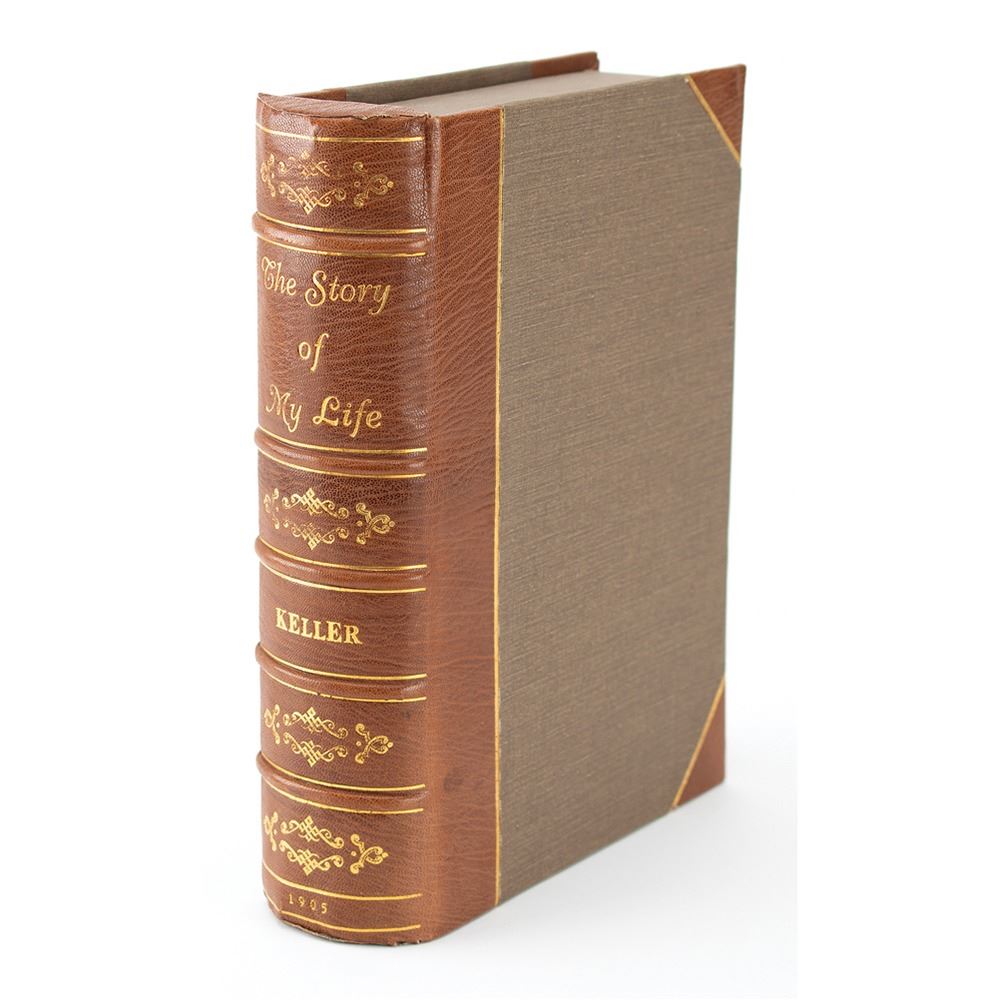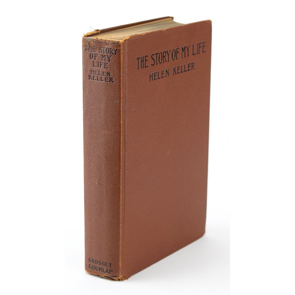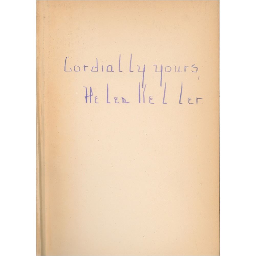 Signed book: The Story of My Life. Later printing. NY: Grosset & Dunlap, 1905. Hardcover, 5.5 x 8.25, 441 pages. Signed on the first free end page in pencil, "Cordially yours, Helen Keller." Housed in an attractive custom-made clamshell case. Autographic condition: fine. Book condition: VG/None, with fraying at spine ends.