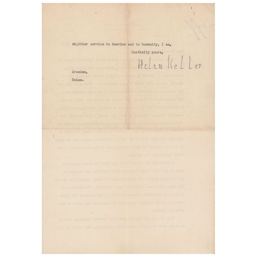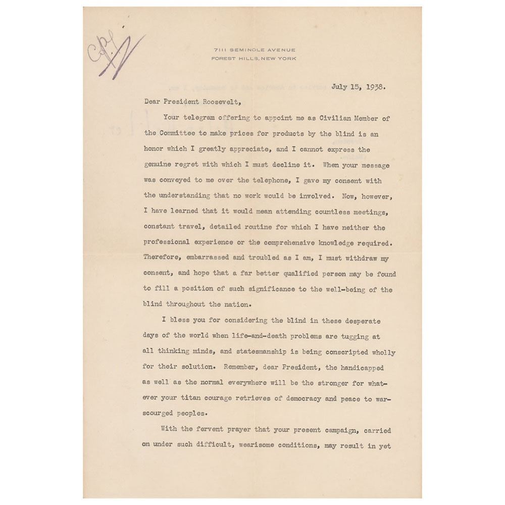 Exceptional TLS signed in pencil, one page both sides, 7.25 x 10.5, Forest Hills, New York letterhead, July 15, 1938. Letter addressed to President Franklin D. Roosevelt, in full: “Your telegram offering to appoint me as a Civilian Member of Committee to make prices for products by the blind is an honor which I greatly appreciate, and I cannot express the genuine regret with which I must decline it. When your message was conveyed to me over the telephone, I gave consent with the understanding that no work would be involved. Now, however, I have learned that it would mean attending countless meetings, constant travel, detailed routine for which I have neither the professional experience or the comprehensive knowledge required. Therefore, embarrassed and troubled as I am, I must withdraw my consent, and hope that a far better qualified person may be found to fill a position of such significance to the well-being of the blind throughout the nation. I bless you for considering the blind in these desperate days of the world when life-and-death problems are tugging at all thinking minds, and statesmanship is being conscripted wholly for their solution. Remember, dear President, the handicapped as well as the normal everywhere will be the stronger for whatever your titan courage retrieves of democracy and peace to war-scourged peoples. With the fervent prayer that your present campaign, carried on under such difficult, wearisome conditions, may result in mightier service to America and to humanity.†In fine condition.