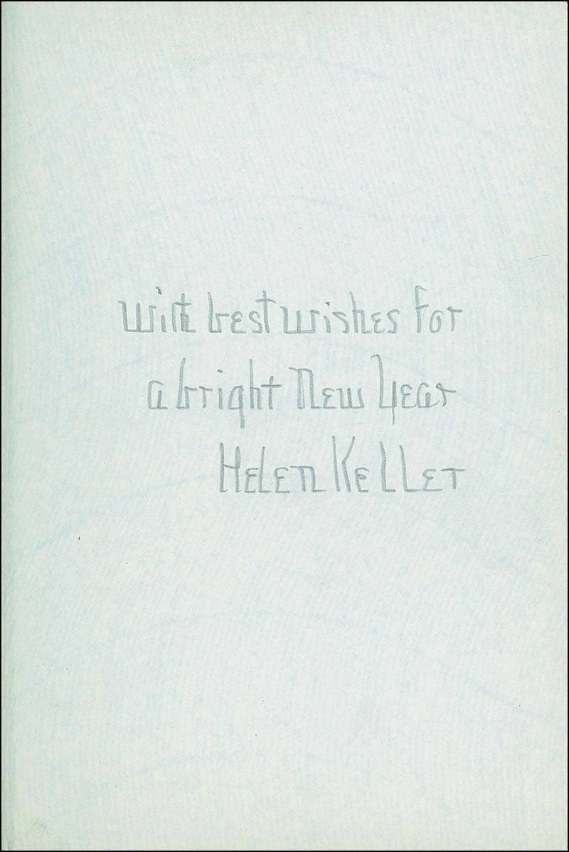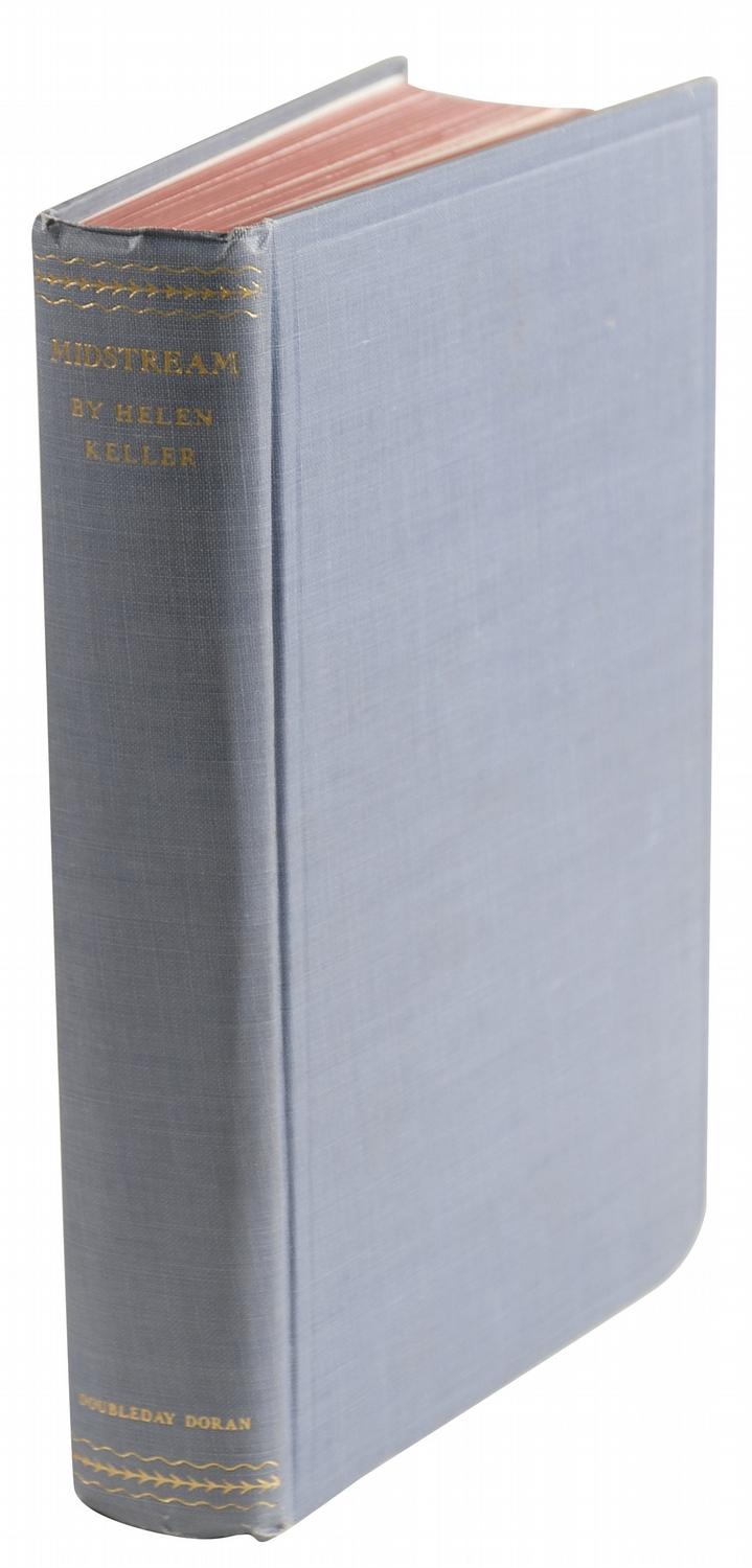 Signed book: Midstream: My Later Life. First edition, first printing. Garden City: Doubleday, Doran & Company, 1929. Hardcover, 6.25 x 9, 362 pages. Signed in pencil on the first free end page “With best wishes for a bright New Year, Helen Keller.” A touch of very mild bumping to spine ends and small adhesive remnant to inside front cover, otherwise fine, clean, condition.