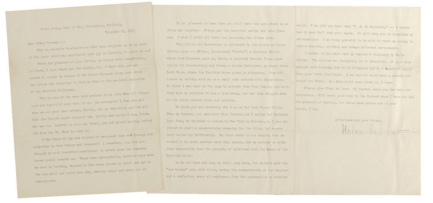 TLS, signed in her usual indelible pencil “Helen Keller,” three pages, 7 x 9, November 16, 1933. Letter written from South Arcan, Muir of Ord, Ross-shire, Scotland, and addressed to a childhood friend, Helen Freeman. In part, “What an adorable touch-picture that name conjures up in my mind of the sweet child who manifested such joy in learning to spell to me! While the pleasure of your letter, so bright with remembrance, is fresh, I must thank you for writing it. I have only not answered it sooner by reason of the three thousand miles over which the letter has traveled to find me here in the pastoral seclusion of the Scottish Highlands. This is one of the rare calm periods in my life when good and beautiful come back to me. In retrospect I feel you all near me—your dear mother, Carrie, who so charmingly spelled all that she thought would interest the little chatterbox I was, Frank, who was too bashful to kiss me, Ethel, you and myself waiting behind the door for Dr. [Edward Everett] Hale to come in. O the beams of joy and ripples of merriment that ran through our playtime…I remember, too, how you dragged me with breathless excitement to safety when the run-away horse rushed towards us. Those were unforgettable, carefree days. This little old farm-house is enlivened by the antics of three darling dogs…they all insist on sitting with me on a small sofa covered with sheep-skins. At first I was kept on the jump to prevent them from tearing the wool, they were so positive it was a live sheep…When my Teacher, our secretary Miss Thomson and I sailed for Scotland last June, we intended to return to New York in October, as I expected to start a money-raising campaign for the blind, but events have turned out differently. We three found to our chagrin that we needed to be under medical care this winter, and we decided to withdraw temporarily from the currents of midstream into the peace of the Scottish hills. We do not know how long we shall stay here, but we have made the ‘wee housie’ snug with fires, books, the companionship of our doggies and a comfortable sense of remoteness from the upheavals of a troubled world. I wonder if you have read my teacher’s biography by Nella Braddy…It is a book charged with tragedy, but it is illumined too by a dauntless spirit that goes forth like light…Dr. Hale would have liked it I know.”