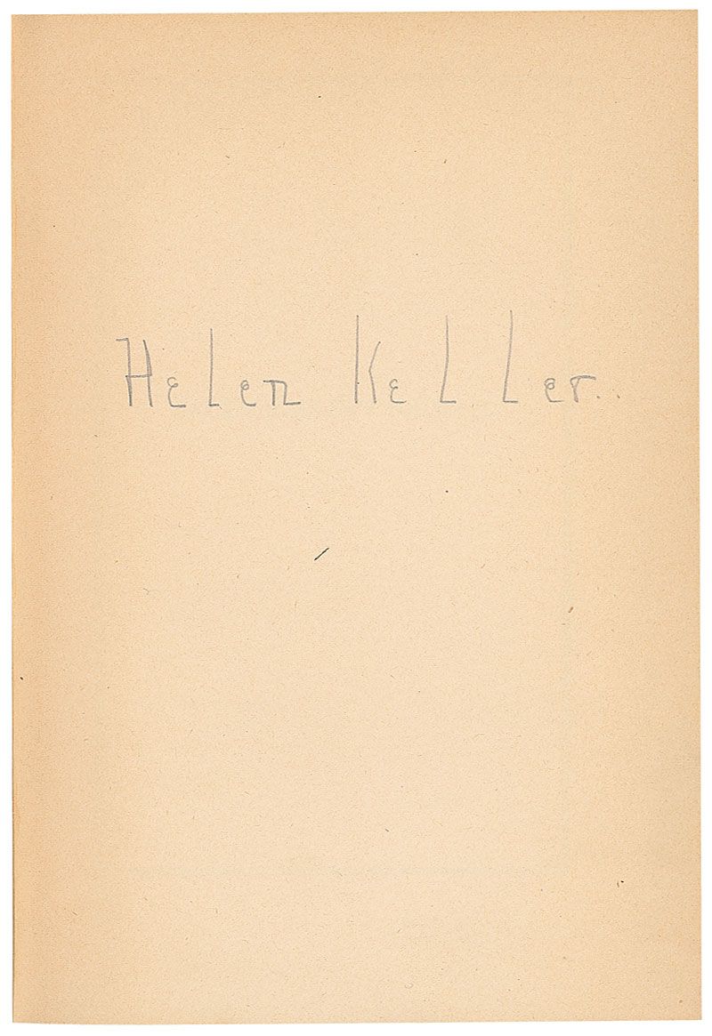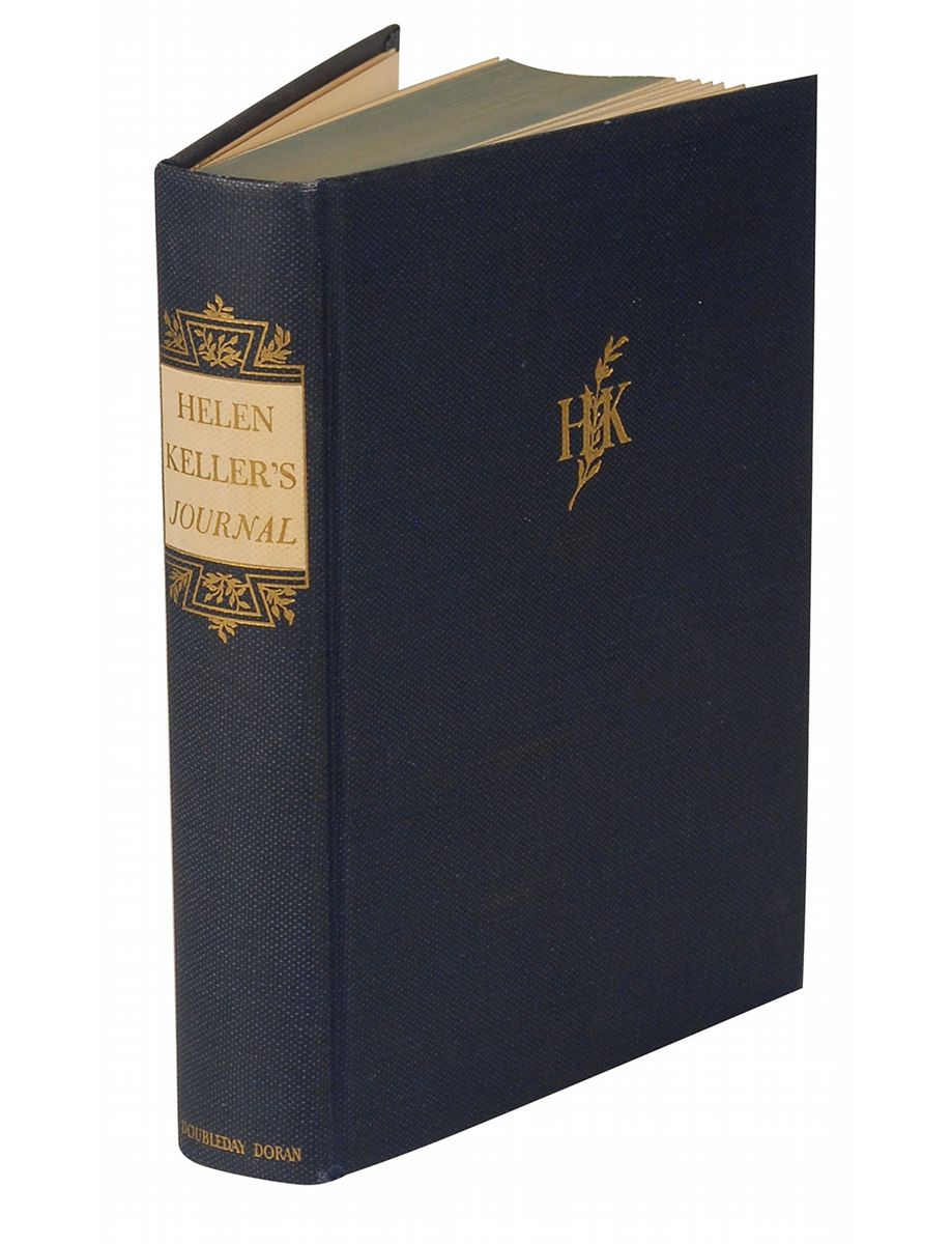 Signed book: Helen Keller’s Journal. First edition. NY: Doubleday, Doran, and Company, 1938. Hardcover, 6 x 8.25, 313 pages. Signed on the second free end page in pencil, “Helen Keller.” Autographic condition: fine, with a uniform shade of toning to signed page. Book condition: VG+/None. Navy cloth-covered boards; spine, textblock edges, and feps slightly yellowed/discolored.