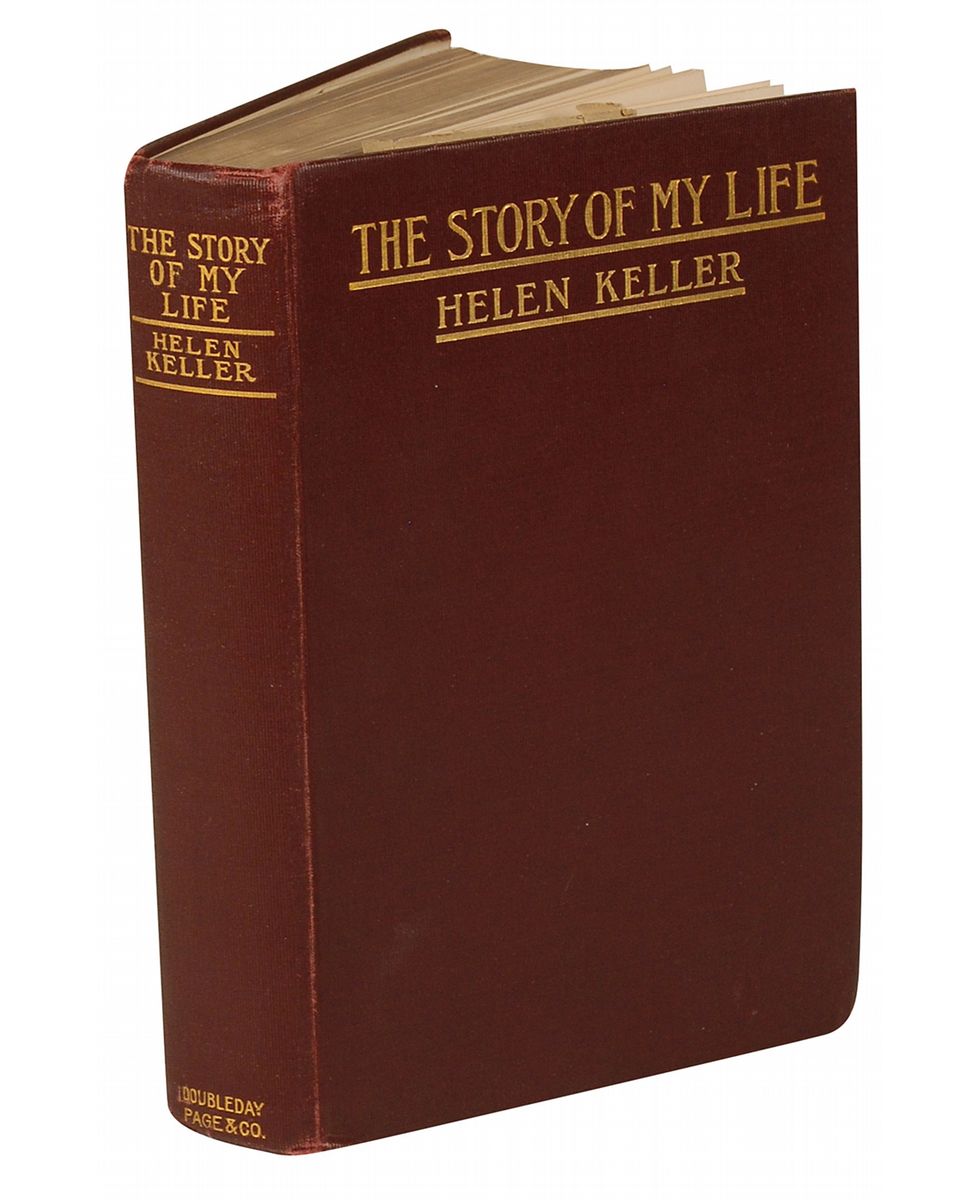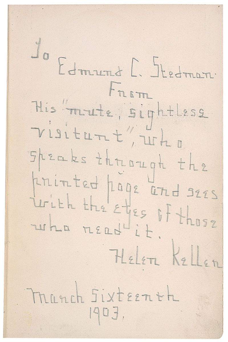 Signed book: The Story of My Life. NY: Doubleday, Page and Company, 1903. Hardcover, 5.25 x 8, 441 pages. Signed and inscribed in pencil on the first free end page to poet Edmund C. Stedman quoting his description of her in his poem ‘Helen Keller,’ “To Edmund C. Stedman From His ‘mute, sightless, visitant,’ who speaks through the printed page and sees with the eyes of those who read it. Helen Keller, March Sixteenth, 1903.” Autographic condition: fine, with expected light soiling and slight rubbing. Book condition: VG/None. Burgundy cloth-covered boards with gilt titles and gilted upper textblock edge; minor bumps at corners; light rubbing, mostly along spine-edges; front hinge and one interior hinge cracked; textblock edges and feps slightly yellowed; two previous owners’ bookplates to front pastedown, along with a small address written in pencil; vertical crease down rfep. Accompanied by a full letter of authenticity from PSA/DNA.
