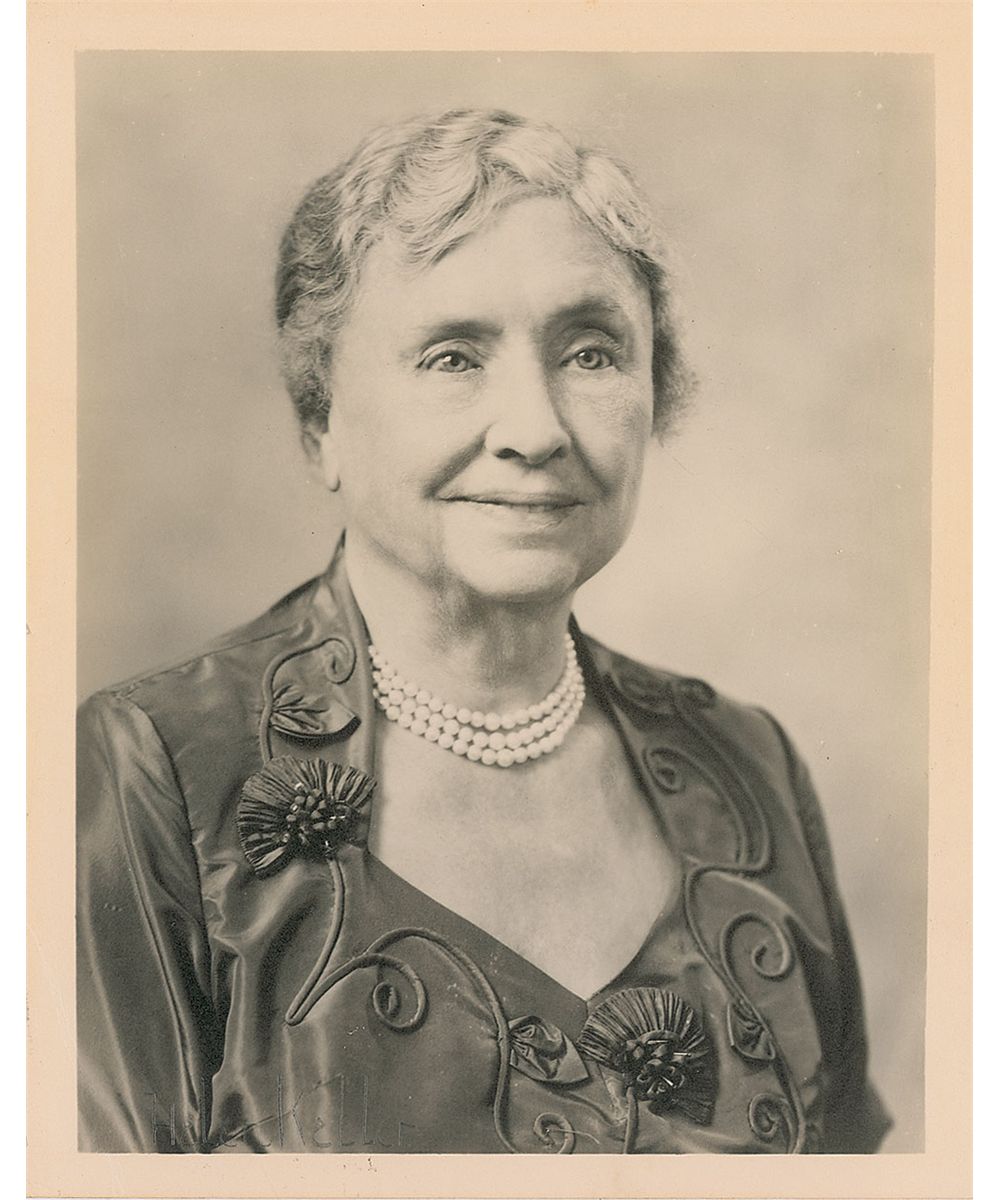 Vintage matte-finish 8 x 10 photo of Keller from her later years, signed along the bottom in pencil. A small tear to left edge, a crease to lower left corner, and moderate to poor contrast to Keller’s signature, otherwise fine condition.