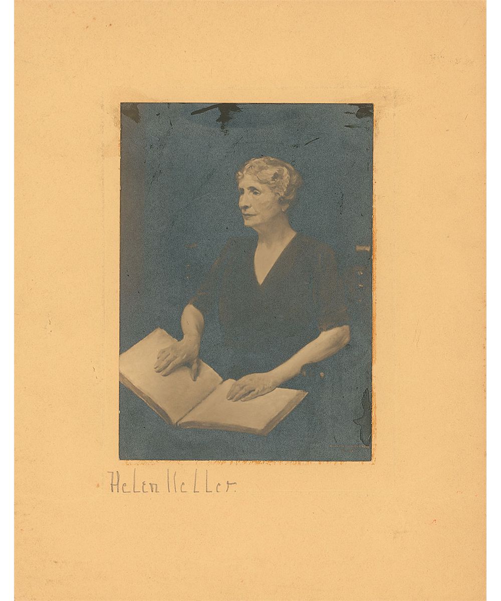 Uncommon 5.75 x 8 silver gelatin photo of Keller by Louis Dreyer, affixed to its original 11 x 14 mount, signed on the mount in pencil. In very good condition, with moderate uniform silvering to dark background, some adhesive stains along edges, and a few creases and scattered light soiling to mount.