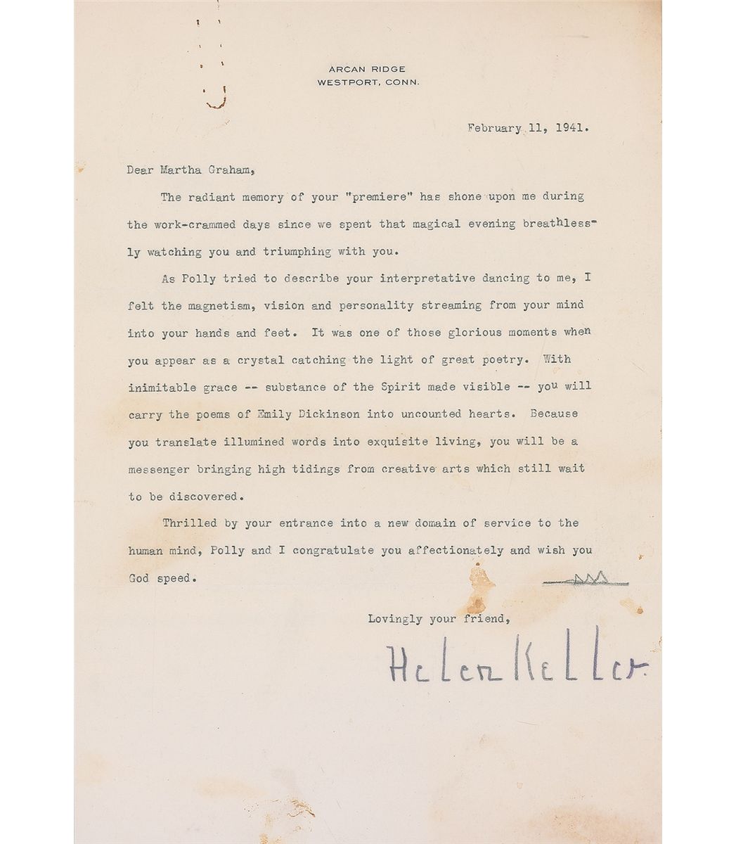 TLS, one page, 7.25 x 10.5, personal letterhead, February 11, 1941. Letter to modern dancer and choreographer Martha Graham. In part: “The radiant memory of your ‘premiere’ has shone upon me during the work-crammed days since we spent that magical evening breathlessly watching you and triumphing with you. As Polly tried to described your interpretative dancing to me, I felt the magnetism, vision and personality streaming from your mind into your hands and feet. It was one of those glorious moments when you appear as a crystal catching the light of great poetry. With inimitable grace—substance of the Spirit made visible—you will carry the poems of Emily Dickinson into uncounted hearts. Because you translate illumined words into exquisite living, you will be a messenger bringing high tidings from creative arts which still wait to be discovered.” Scattered stains and a rusty paperclip mark to the top, otherwise fine condition. Graham’s ballet was entitled ‘Letter to the World’ and based upon the life of Emily Dickinson, who famously began one of her poems with the line ‘This is my letter to the world / That never wrote to me.’ A fabulous letter full of sensory details illuminating Keller’s feelings on experiencing what would generally be considered an aural and visual art form.