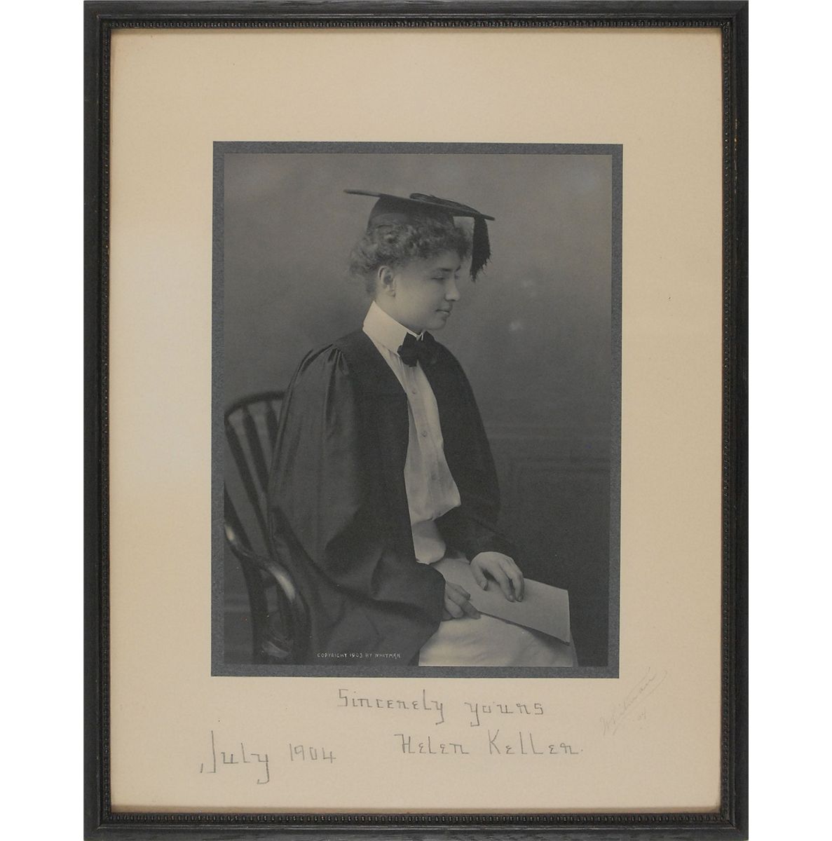 Highly appealing matte-finish 6.5 x 9 photo of Keller when she graduated from Radcliffe College, affixed to its original 10.5 x 13.25 mount, signed on the mount in pencil, “Sincerely yours, Helen Keller, July 1904.” Also signed in the lower right in pencil by the photography studio, “Whitman ’04.” Framed to an overall size of 11.5 x 14.5. In fine condition. A wonderful, early piece.